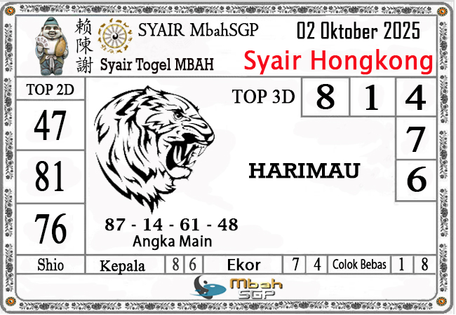 MbahSGP – Syair HK Mbah Sukro 02 Oktober 2025 – Gambar Syair Togel Hongkong hari ini kode teka teki buntut HKG malam ini yang mengandalkan keberuntungan pemainnya berikut kami rangkum bersama kumpulan prediksi angka jitu yang bekerjasama dengan prediktor angka yang sudah berpengalaman daolam melakukan kalkulasi angka yang akan keluar di jamin akan membawa anda merasakan sensasi mendapatkan JP 4D, 3D dan 2D . Semoga Semua Prediksi yang kami berikan dapat bermanfaat untuk anda para pecinta togel yang ada di dunia khususnya di Indonesia dan kami sangat berterima kasih apabila anda telah mempercayai kami sebagai team prediksi yang dapat di percaya.