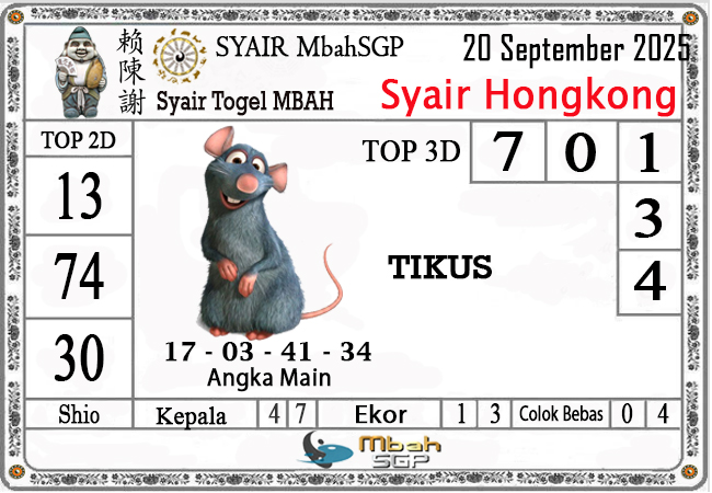 MbahSGPSyair HK Mbah Sukro 20 September 2025 – Gambar Syair Togel Hongkong hari ini kode teka teki buntut HKG malam ini yang mengandalkan keberuntungan pemainnya berikut kami rangkum bersama kumpulan prediksi angka jitu yang bekerjasama dengan prediktor angka yang sudah berpengalaman daolam melakukan kalkulasi angka yang akan keluar di jamin akan membawa anda merasakan sensasi mendapatkan JP 4D, 3D dan 2D . Semoga Semua Prediksi yang kami berikan dapat bermanfaat untuk anda para pecinta togel yang ada di dunia khususnya di Indonesia dan kami sangat berterima kasih apabila anda telah mempercayai kami sebagai team prediksi yang dapat di percaya.