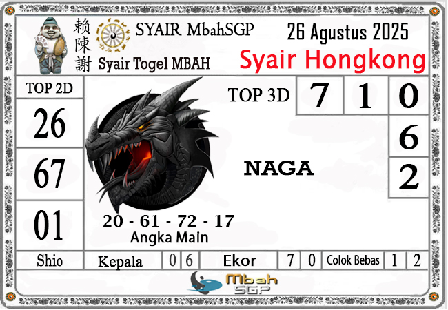 MbahSGP – Syair HK Mbah Sukro 26 Agustus 2025 – Gambar Syair Togel Hongkong hari ini kode teka teki buntut HKG malam ini yang mengandalkan keberuntungan pemainnya berikut kami rangkum bersama kumpulan prediksi angka jitu yang bekerjasama dengan prediktor angka yang sudah berpengalaman daolam melakukan kalkulasi angka yang akan keluar di jamin akan membawa anda merasakan sensasi mendapatkan JP 4D, 3D dan 2D . Semoga Semua Prediksi yang kami berikan dapat bermanfaat untuk anda para pecinta togel yang ada di dunia khususnya di Indonesia dan kami sangat berterima kasih apabila anda telah mempercayai kami sebagai team prediksi yang dapat di percaya.