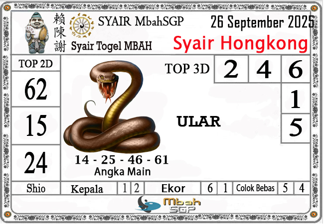 MbahSGP – Syair HK Mbah Sukro 26 September 2025 – Gambar Syair Togel Hongkong hari ini kode teka teki buntut HKG malam ini yang mengandalkan keberuntungan pemainnya berikut kami rangkum bersama kumpulan prediksi angka jitu yang bekerjasama dengan prediktor angka yang sudah berpengalaman daolam melakukan kalkulasi angka yang akan keluar di jamin akan membawa anda merasakan sensasi mendapatkan JP 4D, 3D dan 2D . Semoga Semua Prediksi yang kami berikan dapat bermanfaat untuk anda para pecinta togel yang ada di dunia khususnya di Indonesia dan kami sangat berterima kasih apabila anda telah mempercayai kami sebagai team prediksi yang dapat di percaya.