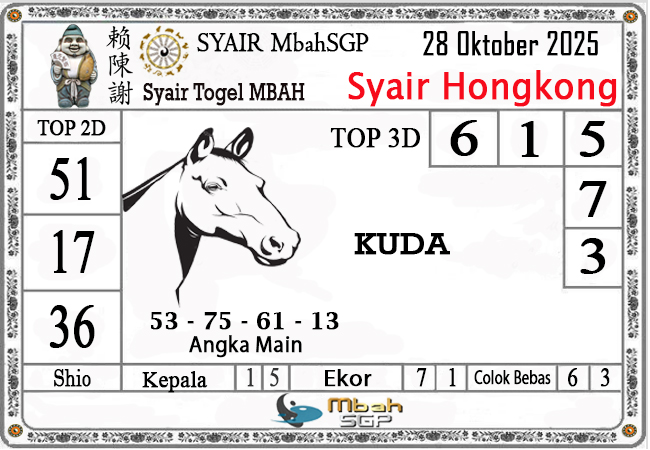 MbahSGP – Syair HK Mbah Sukro 28 Oktober 2025 – Gambar Syair Togel Hongkong hari ini kode teka teki buntut HKG malam ini yang mengandalkan keberuntungan pemainnya berikut kami rangkum bersama kumpulan prediksi angka jitu yang bekerjasama dengan prediktor angka yang sudah berpengalaman daolam melakukan kalkulasi angka yang akan keluar di jamin akan membawa anda merasakan sensasi mendapatkan JP 4D, 3D dan 2D . Semoga Semua Prediksi yang kami berikan dapat bermanfaat untuk anda para pecinta togel yang ada di dunia khususnya di Indonesia dan kami sangat berterima kasih apabila anda telah mempercayai kami sebagai team prediksi yang dapat di percaya.
