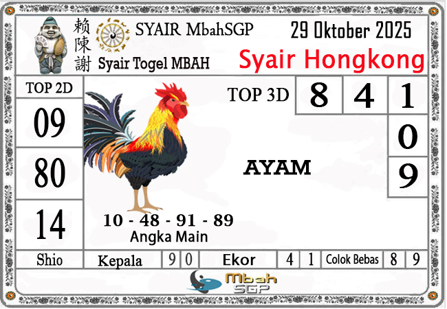 MbahSGP – Syair HK Mbah Sukro 29 Oktober 2025 – Gambar Syair Togel Hongkong hari ini kode teka teki buntut HKG malam ini yang mengandalkan keberuntungan pemainnya berikut kami rangkum bersama kumpulan prediksi angka jitu yang bekerjasama dengan prediktor angka yang sudah berpengalaman daolam melakukan kalkulasi angka yang akan keluar di jamin akan membawa anda merasakan sensasi mendapatkan JP 4D, 3D dan 2D . Semoga Semua Prediksi yang kami berikan dapat bermanfaat untuk anda para pecinta togel yang ada di dunia khususnya di Indonesia dan kami sangat berterima kasih apabila anda telah mempercayai kami sebagai team prediksi yang dapat di percaya.
