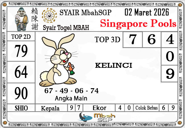 MbahSGP – Syair SGP Mbah Kewod 02 Maret 2026 – Syair Togel angka yang mengandalkan keberuntungan pemainnya berikut kami rangkum bersama kumpulan prediksi angka jitu yang bekerjasama dengan prediktor angka yang sudah berpengalaman dalam melakukan kalkulasi angka yang akan keluar di jamin akan membawa anda merasakan sensasi mendapatkan JP 4D, 3D dan 2D . Semoga Semua Prediksi yang kami berikan dapat bermanfaat untuk anda para pecinta togel yang ada di dunia khususnya di Indonesia dan kami sangat berterima kasih apabila anda telah mempercayai kami sebagai team prediksi yang dapat di percaya.