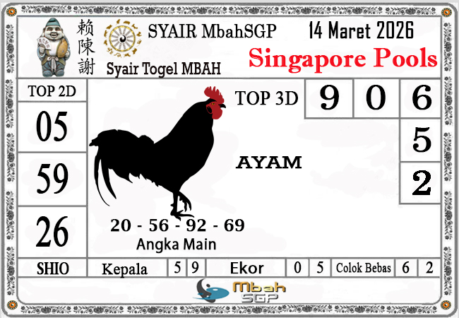 MbahSGP – Syair SGP Mbah Kewod 14 Maret 2026 – Syair Togel angka yang mengandalkan keberuntungan pemainnya berikut kami rangkum bersama kumpulan prediksi angka jitu yang bekerjasama dengan prediktor angka yang sudah berpengalaman dalam melakukan kalkulasi angka yang akan keluar di jamin akan membawa anda merasakan sensasi mendapatkan JP 4D, 3D dan 2D . Semoga Semua Prediksi yang kami berikan dapat bermanfaat untuk anda para pecinta togel yang ada di dunia khususnya di Indonesia dan kami sangat berterima kasih apabila anda telah mempercayai kami sebagai team prediksi yang dapat di percaya.