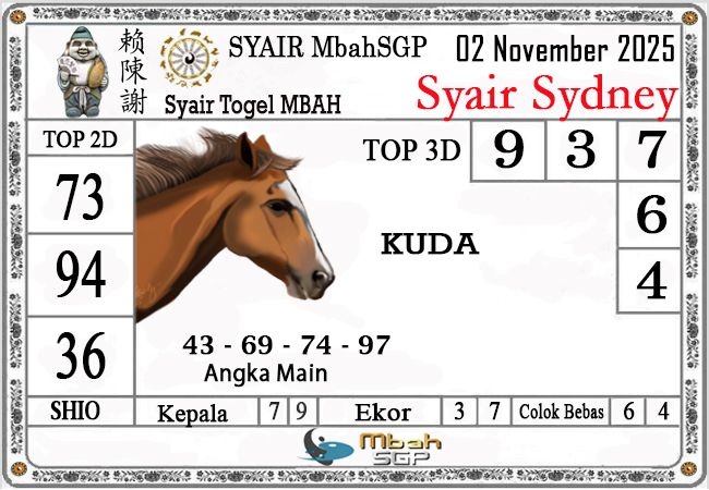 MbahSGP – Syair Sydney Mbah Sugeng 02-11-2025 – prediksi togel sydney, bocoran togel sydney, gambar syair togel sydney, syair sydney, prediksi togel wla sd, gambar syair mbahsgp, rumusan togel sydney, sydneypools. Syair mbahsgp merupakan brand syair yang telah lama dikenal oleh kalangan pemain lama didalam bermain togel. Syair mbahsgp telah lama datang dikalangan masyarakat. Oleh dikarenakan telah dipercayai banyak kalangan, maka kita tidak akan diberikan kekecewaan dalam bermain di togel sydney , Syair mbahsgp sydney yang kita sajikan ini merupakan rumusan angka dari sang prediksitor handal.