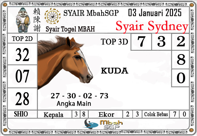 MbahSGP – Syair Sydney Mbah Sugeng 03-01-2025 – prediksi togel sydney, bocoran togel sydney, gambar syair togel sydney, syair sydney, prediksi togel wla sd, gambar syair mbahsgp, rumusan togel sydney, sydneypools. Syair mbahsgp merupakan brand syair yang telah lama dikenal oleh kalangan pemain lama didalam bermain togel. Syair mbahsgp telah lama datang dikalangan masyarakat. Oleh dikarenakan telah dipercayai banyak kalangan, maka kita tidak akan diberikan kekecewaan dalam bermain di togel sydney , Syair mbahsgp sydney yang kita sajikan ini merupakan rumusan angka dari sang prediksitor handal.