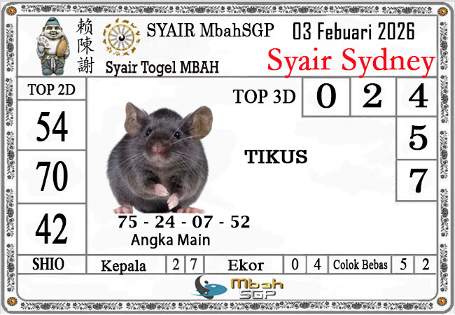 MbahSGP – Syair Sydney Mbah Sugeng 03-02-2026 – prediksi togel sydney, bocoran togel sydney, gambar syair togel sydney, syair sydney, prediksi togel wla sd, gambar syair mbahsgp, rumusan togel sydney, sydneypools. Syair mbahsgp merupakan brand syair yang telah lama dikenal oleh kalangan pemain lama didalam bermain togel. Syair mbahsgp telah lama datang dikalangan masyarakat. Oleh dikarenakan telah dipercayai banyak kalangan, maka kita tidak akan diberikan kekecewaan dalam bermain di togel sydney , Syair mbahsgp sydney yang kita sajikan ini merupakan rumusan angka dari sang prediksitor handal.