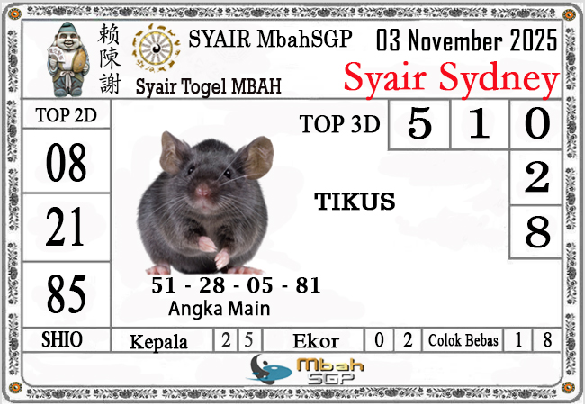 MbahSGP – Syair Sydney Mbah Sugeng 03-11-2025 – prediksi togel sydney, bocoran togel sydney, gambar syair togel sydney, syair sydney, prediksi togel wla sd, gambar syair mbahsgp, rumusan togel sydney, sydneypools. Syair mbahsgp merupakan brand syair yang telah lama dikenal oleh kalangan pemain lama didalam bermain togel. Syair mbahsgp telah lama datang dikalangan masyarakat. Oleh dikarenakan telah dipercayai banyak kalangan, maka kita tidak akan diberikan kekecewaan dalam bermain di togel sydney , Syair mbahsgp sydney yang kita sajikan ini merupakan rumusan angka dari sang prediksitor handal.