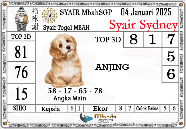 MbahSGP Syair Sydney Mbah Sugeng 04-01-2025 – prediksi togel sydney, bocoran togel sydney, gambar syair togel sydney, syair sydney, prediksi togel wla sd, gambar syair mbahsgp, rumusan togel sydney, sydneypools. Syair mbahsgp merupakan brand syair yang telah lama dikenal oleh kalangan pemain lama didalam bermain togel. Syair mbahsgp telah lama datang dikalangan masyarakat. Oleh dikarenakan telah dipercayai banyak kalangan, maka kita tidak akan diberikan kekecewaan dalam bermain di togel sydney , Syair mbahsgp sydney yang kita sajikan ini merupakan rumusan angka dari sang prediksitor handal.