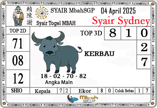 MbahSGP – Syair Sydney Mbah Sugeng 04-04-2026 – prediksi togel sydney, bocoran togel sydney, gambar syair togel sydney, syair sydney, prediksi togel wla sd, gambar syair mbahsgp, rumusan togel sydney, sydneypools. Syair mbahsgp merupakan brand syair yang telah lama dikenal oleh kalangan pemain lama didalam bermain togel. Syair mbahsgp telah lama datang dikalangan masyarakat. Oleh dikarenakan telah dipercayai banyak kalangan, maka kita tidak akan diberikan kekecewaan dalam bermain di togel sydney , Syair mbahsgp sydney yang kita sajikan ini merupakan rumusan angka dari sang prediksitor handal.