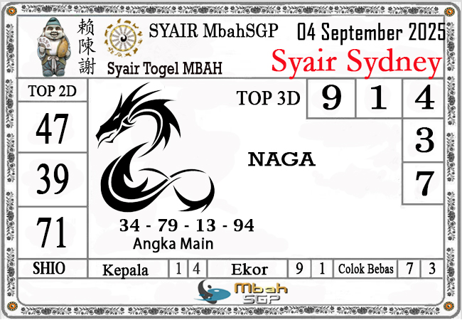 MbahSGP Syair Sydney Mbah Sugeng 04-09-2025 – prediksi togel sydney, bocoran togel sydney, gambar syair togel sydney, syair sydney, prediksi togel wla sd, gambar syair mbahsgp, rumusan togel sydney, sydneypools. Syair mbahsgp merupakan brand syair yang telah lama dikenal oleh kalangan pemain lama didalam bermain togel. Syair mbahsgp telah lama datang dikalangan masyarakat. Oleh dikarenakan telah dipercayai banyak kalangan, maka kita tidak akan diberikan kekecewaan dalam bermain di togel sydney , Syair mbahsgp sydney yang kita sajikan ini merupakan rumusan angka dari sang prediksitor handal.