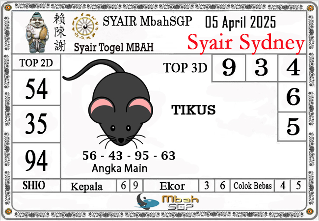 MbahSGP – Syair Sydney Mbah Sugeng 05-04-2026 – prediksi togel sydney, bocoran togel sydney, gambar syair togel sydney, syair sydney, prediksi togel wla sd, gambar syair mbahsgp, rumusan togel sydney, sydneypools. Syair mbahsgp merupakan brand syair yang telah lama dikenal oleh kalangan pemain lama didalam bermain togel. Syair mbahsgp telah lama datang dikalangan masyarakat. Oleh dikarenakan telah dipercayai banyak kalangan, maka kita tidak akan diberikan kekecewaan dalam bermain di togel sydney , Syair mbahsgp sydney yang kita sajikan ini merupakan rumusan angka dari sang prediksitor handal.