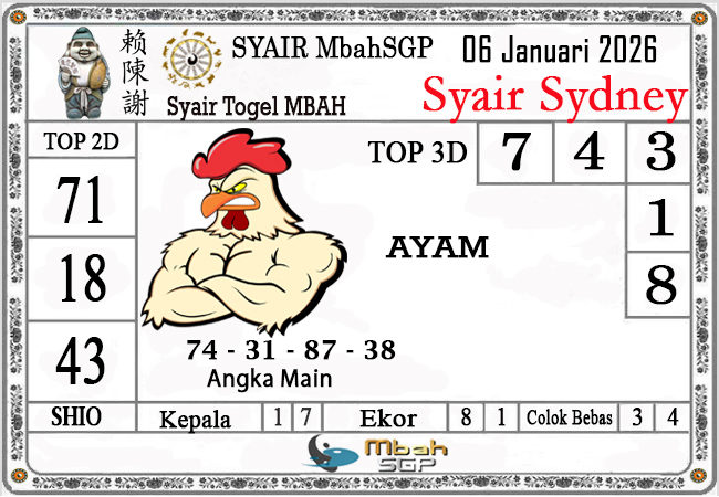 MbahSGP – Syair Sydney Mbah Sugeng 06-01-2025 – prediksi togel sydney, bocoran togel sydney, gambar syair togel sydney, syair sydney, prediksi togel wla sd, gambar syair mbahsgp, rumusan togel sydney, sydneypools. Syair mbahsgp merupakan brand syair yang telah lama dikenal oleh kalangan pemain lama didalam bermain togel. Syair mbahsgp telah lama datang dikalangan masyarakat. Oleh dikarenakan telah dipercayai banyak kalangan, maka kita tidak akan diberikan kekecewaan dalam bermain di togel sydney , Syair mbahsgp sydney yang kita sajikan ini merupakan rumusan angka dari sang prediksitor handal.