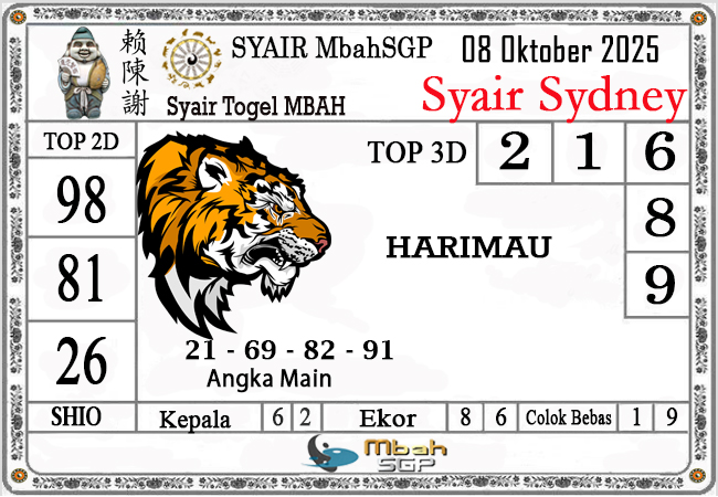 MbahSGP – Syair Sydney Mbah Sugeng 08-10-2025 – prediksi togel sydney, bocoran togel sydney, gambar syair togel sydney, syair sydney, prediksi togel wla sd, gambar syair mbahsgp, rumusan togel sydney, sydneypools. Syair mbahsgp merupakan brand syair yang telah lama dikenal oleh kalangan pemain lama didalam bermain togel. Syair mbahsgp telah lama datang dikalangan masyarakat. Oleh dikarenakan telah dipercayai banyak kalangan, maka kita tidak akan diberikan kekecewaan dalam bermain di togel sydney , Syair mbahsgp sydney yang kita sajikan ini merupakan rumusan angka dari sang prediksitor handal.