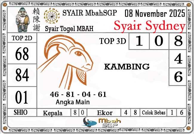 MbahSGP – Syair Sydney Mbah Sugeng 08-11-2025 – prediksi togel sydney, bocoran togel sydney, gambar syair togel sydney, syair sydney, prediksi togel wla sd, gambar syair mbahsgp, rumusan togel sydney, sydneypools. Syair mbahsgp merupakan brand syair yang telah lama dikenal oleh kalangan pemain lama didalam bermain togel. Syair mbahsgp telah lama datang dikalangan masyarakat. Oleh dikarenakan telah dipercayai banyak kalangan, maka kita tidak akan diberikan kekecewaan dalam bermain di togel sydney , Syair mbahsgp sydney yang kita sajikan ini merupakan rumusan angka dari sang prediksitor handal.
