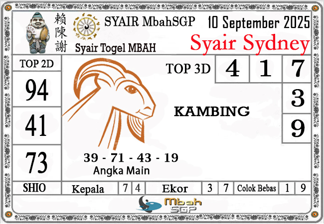 MbahSGP – Syair Sydney Mbah Sugeng 10-09-2025 – prediksi togel sydney, bocoran togel sydney, gambar syair togel sydney, syair sydney, prediksi togel wla sd, gambar syair mbahsgp, rumusan togel sydney, sydneypools. Syair mbahsgp merupakan brand syair yang telah lama dikenal oleh kalangan pemain lama didalam bermain togel. Syair mbahsgp telah lama datang dikalangan masyarakat. Oleh dikarenakan telah dipercayai banyak kalangan, maka kita tidak akan diberikan kekecewaan dalam bermain di togel sydney , Syair mbahsgp sydney yang kita sajikan ini merupakan rumusan angka dari sang prediksitor handal.