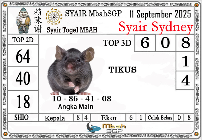 MbahSGP Syair Sydney Mbah Sugeng 11-09-2025 – prediksi togel sydney, bocoran togel sydney, gambar syair togel sydney, syair sydney, prediksi togel wla sd, gambar syair mbahsgp, rumusan togel sydney, sydneypools. Syair mbahsgp merupakan brand syair yang telah lama dikenal oleh kalangan pemain lama didalam bermain togel. Syair mbahsgp telah lama datang dikalangan masyarakat. Oleh dikarenakan telah dipercayai banyak kalangan, maka kita tidak akan diberikan kekecewaan dalam bermain di togel sydney , Syair mbahsgp sydney yang kita sajikan ini merupakan rumusan angka dari sang prediksitor handal.
