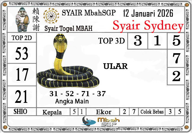 MbahSGP – Syair Sydney Mbah Sugeng 12-01-2025 – prediksi togel sydney, bocoran togel sydney, gambar syair togel sydney, syair sydney, prediksi togel wla sd, gambar syair mbahsgp, rumusan togel sydney, sydneypools. Syair mbahsgp merupakan brand syair yang telah lama dikenal oleh kalangan pemain lama didalam bermain togel. Syair mbahsgp telah lama datang dikalangan masyarakat. Oleh dikarenakan telah dipercayai banyak kalangan, maka kita tidak akan diberikan kekecewaan dalam bermain di togel sydney , Syair mbahsgp sydney yang kita sajikan ini merupakan rumusan angka dari sang prediksitor handal.