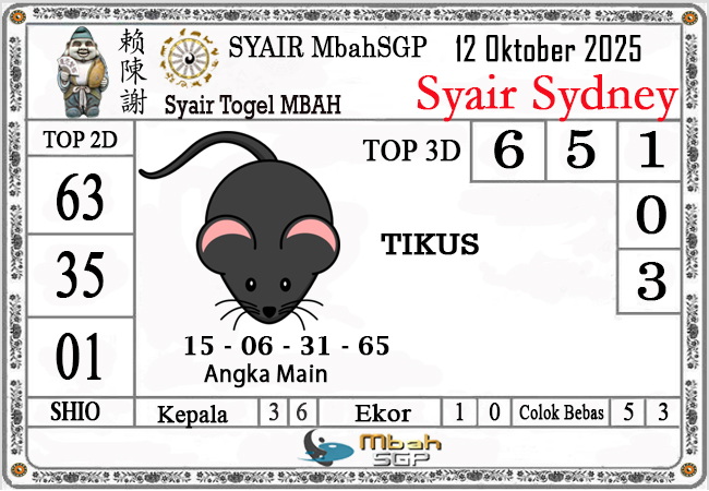 MbahSGP – Syair Sydney Mbah Sugeng 12-10-2025 – prediksi togel sydney, bocoran togel sydney, gambar syair togel sydney, syair sydney, prediksi togel wla sd, gambar syair mbahsgp, rumusan togel sydney, sydneypools. Syair mbahsgp merupakan brand syair yang telah lama dikenal oleh kalangan pemain lama didalam bermain togel. Syair mbahsgp telah lama datang dikalangan masyarakat. Oleh dikarenakan telah dipercayai banyak kalangan, maka kita tidak akan diberikan kekecewaan dalam bermain di togel sydney , Syair mbahsgp sydney yang kita sajikan ini merupakan rumusan angka dari sang prediksitor handal.