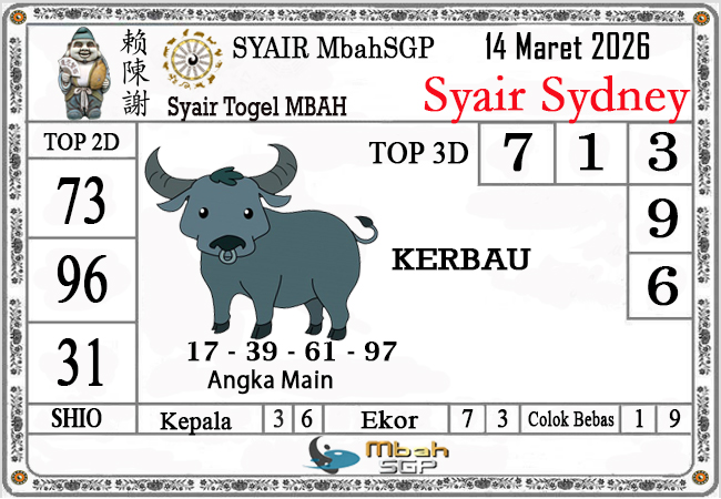 MbahSGP – Syair Sydney Mbah Sugeng 14-03-2026 – prediksi togel sydney, bocoran togel sydney, gambar syair togel sydney, syair sydney, prediksi togel wla sd, gambar syair mbahsgp, rumusan togel sydney, sydneypools. Syair mbahsgp merupakan brand syair yang telah lama dikenal oleh kalangan pemain lama didalam bermain togel. Syair mbahsgp telah lama datang dikalangan masyarakat. Oleh dikarenakan telah dipercayai banyak kalangan, maka kita tidak akan diberikan kekecewaan dalam bermain di togel sydney , Syair mbahsgp sydney yang kita sajikan ini merupakan rumusan angka dari sang prediksitor handal.