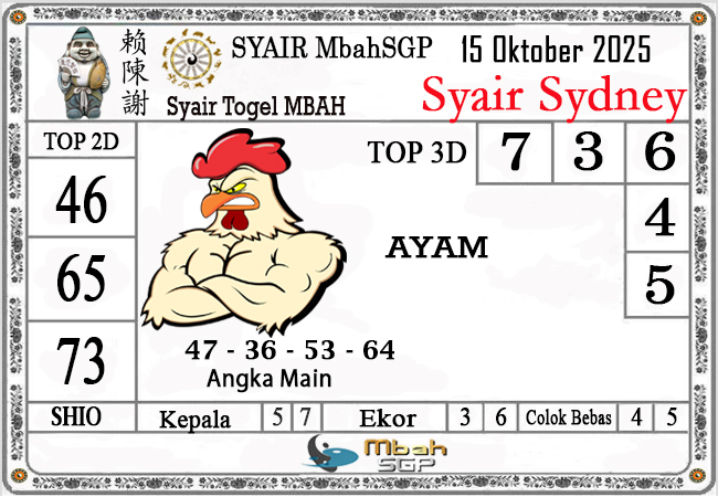 MbahSGP Syair Sydney Mbah Sugeng 15-10-2025 – prediksi togel sydney, bocoran togel sydney, gambar syair togel sydney, syair sydney, prediksi togel wla sd, gambar syair mbahsgp, rumusan togel sydney, sydneypools. Syair mbahsgp merupakan brand syair yang telah lama dikenal oleh kalangan pemain lama didalam bermain togel. Syair mbahsgp telah lama datang dikalangan masyarakat. Oleh dikarenakan telah dipercayai banyak kalangan, maka kita tidak akan diberikan kekecewaan dalam bermain di togel sydney , Syair mbahsgp sydney yang kita sajikan ini merupakan rumusan angka dari sang prediksitor handal.