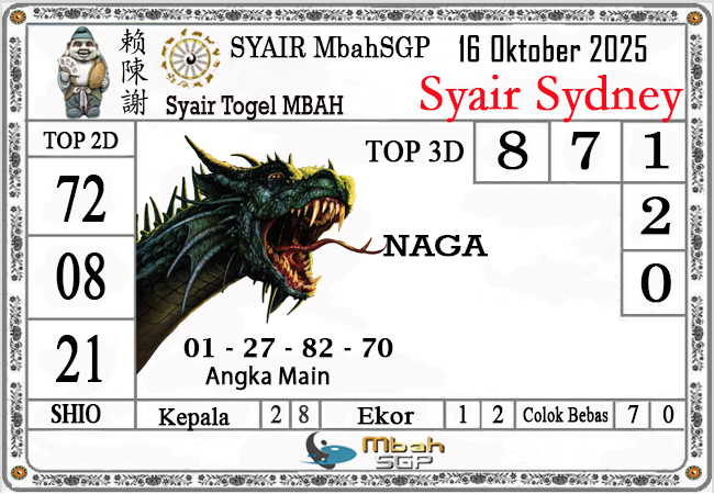 MbahSGP – Syair Sydney Mbah Sugeng 16-10-2025 – prediksi togel sydney, bocoran togel sydney, gambar syair togel sydney, syair sydney, prediksi togel wla sd, gambar syair mbahsgp, rumusan togel sydney, sydneypools. Syair mbahsgp merupakan brand syair yang telah lama dikenal oleh kalangan pemain lama didalam bermain togel. Syair mbahsgp telah lama datang dikalangan masyarakat. Oleh dikarenakan telah dipercayai banyak kalangan, maka kita tidak akan diberikan kekecewaan dalam bermain di togel sydney , Syair mbahsgp sydney yang kita sajikan ini merupakan rumusan angka dari sang prediksitor handal.