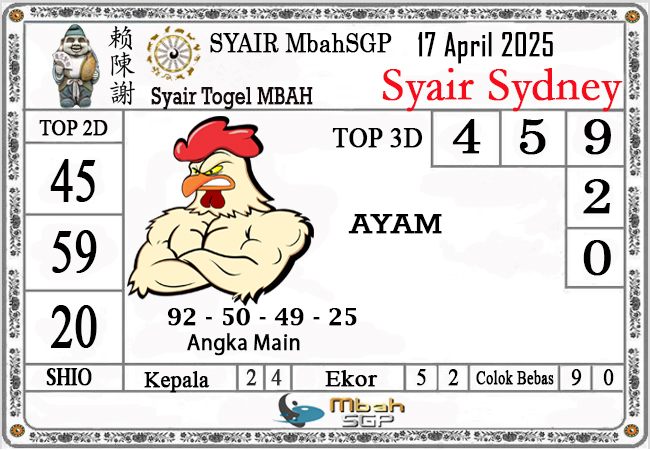 MbahSGP Syair Sydney Mbah Sugeng 17-04-2026 – prediksi togel sydney, bocoran togel sydney, gambar syair togel sydney, syair sydney, prediksi togel wla sd, gambar syair mbahsgp, rumusan togel sydney, sydneypools. Syair mbahsgp merupakan brand syair yang telah lama dikenal oleh kalangan pemain lama didalam bermain togel. Syair mbahsgp telah lama datang dikalangan masyarakat. Oleh dikarenakan telah dipercayai banyak kalangan, maka kita tidak akan diberikan kekecewaan dalam bermain di togel sydney , Syair mbahsgp sydney yang kita sajikan ini merupakan rumusan angka dari sang prediksitor handal.