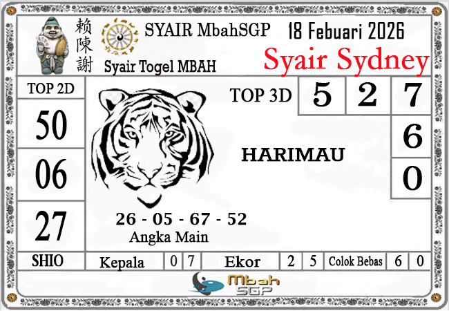 MbahSGP Syair Sydney Mbah Sugeng 18-02-2026 – prediksi togel sydney, bocoran togel sydney, gambar syair togel sydney, syair sydney, prediksi togel wla sd, gambar syair mbahsgp, rumusan togel sydney, sydneypools. Syair mbahsgp merupakan brand syair yang telah lama dikenal oleh kalangan pemain lama didalam bermain togel. Syair mbahsgp telah lama datang dikalangan masyarakat. Oleh dikarenakan telah dipercayai banyak kalangan, maka kita tidak akan diberikan kekecewaan dalam bermain di togel sydney , Syair mbahsgp sydney yang kita sajikan ini merupakan rumusan angka dari sang prediksitor handal.