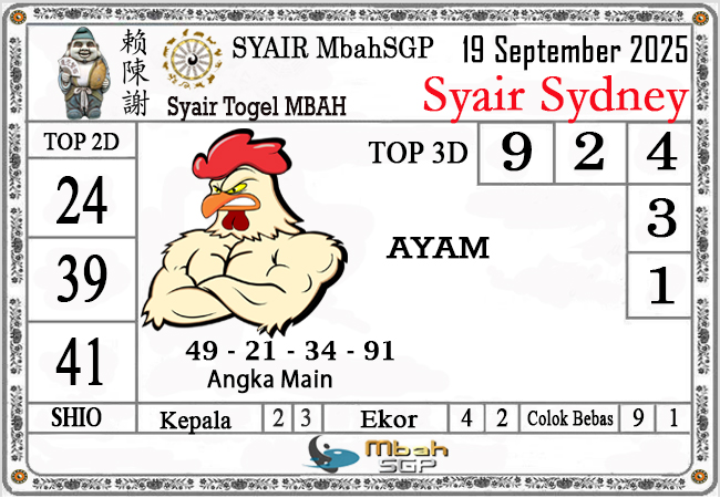 MbahSGP – Syair Sydney Mbah Sugeng 19-09-2025 – prediksi togel sydney, bocoran togel sydney, gambar syair togel sydney, syair sydney, prediksi togel wla sd, gambar syair mbahsgp, rumusan togel sydney, sydneypools. Syair mbahsgp merupakan brand syair yang telah lama dikenal oleh kalangan pemain lama didalam bermain togel. Syair mbahsgp telah lama datang dikalangan masyarakat. Oleh dikarenakan telah dipercayai banyak kalangan, maka kita tidak akan diberikan kekecewaan dalam bermain di togel sydney , Syair mbahsgp sydney yang kita sajikan ini merupakan rumusan angka dari sang prediksitor handal.