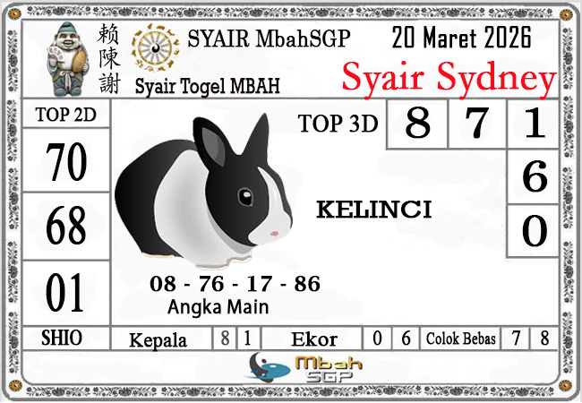 MbahSGP – Syair Sydney Mbah Sugeng 20-03-2026 – prediksi togel sydney, bocoran togel sydney, gambar syair togel sydney, syair sydney, prediksi togel wla sd, gambar syair mbahsgp, rumusan togel sydney, sydneypools. Syair mbahsgp merupakan brand syair yang telah lama dikenal oleh kalangan pemain lama didalam bermain togel. Syair mbahsgp telah lama datang dikalangan masyarakat. Oleh dikarenakan telah dipercayai banyak kalangan, maka kita tidak akan diberikan kekecewaan dalam bermain di togel sydney , Syair mbahsgp sydney yang kita sajikan ini merupakan rumusan angka dari sang prediksitor handal.