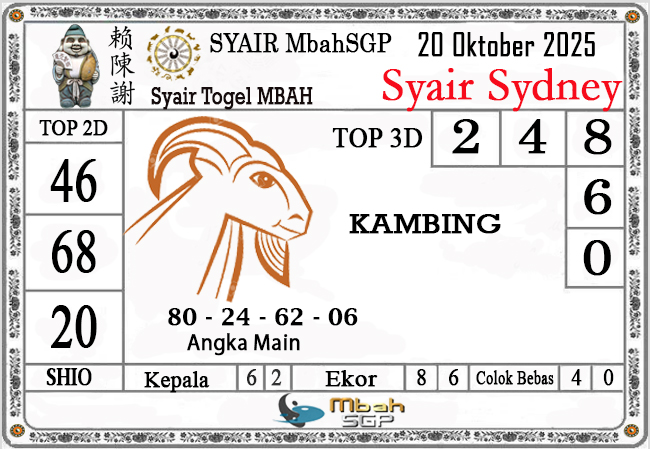 MbahSGP – Syair Sydney Mbah Sugeng 20-10-2025 – prediksi togel sydney, bocoran togel sydney, gambar syair togel sydney, syair sydney, prediksi togel wla sd, gambar syair mbahsgp, rumusan togel sydney, sydneypools. Syair mbahsgp merupakan brand syair yang telah lama dikenal oleh kalangan pemain lama didalam bermain togel. Syair mbahsgp telah lama datang dikalangan masyarakat. Oleh dikarenakan telah dipercayai banyak kalangan, maka kita tidak akan diberikan kekecewaan dalam bermain di togel sydney , Syair mbahsgp sydney yang kita sajikan ini merupakan rumusan angka dari sang prediksitor handal.
