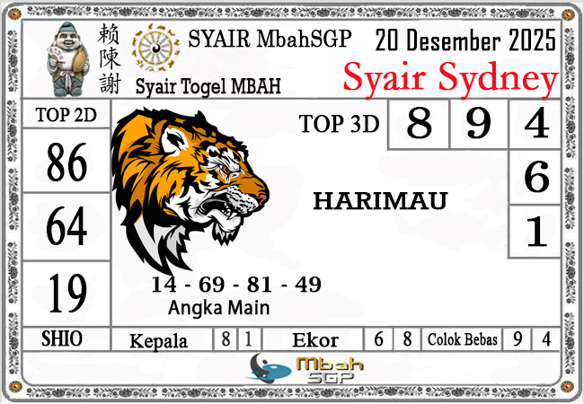 MbahSGP Syair Sydney Mbah Sugeng 20-12-2025 – prediksi togel sydney, bocoran togel sydney, gambar syair togel sydney, syair sydney, prediksi togel wla sd, gambar syair mbahsgp, rumusan togel sydney, sydneypools. Syair mbahsgp merupakan brand syair yang telah lama dikenal oleh kalangan pemain lama didalam bermain togel. Syair mbahsgp telah lama datang dikalangan masyarakat. Oleh dikarenakan telah dipercayai banyak kalangan, maka kita tidak akan diberikan kekecewaan dalam bermain di togel sydney , Syair mbahsgp sydney yang kita sajikan ini merupakan rumusan angka dari sang prediksitor handal.