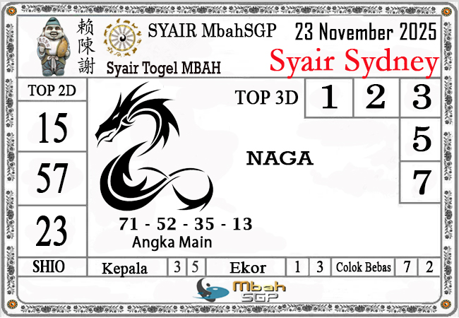 MbahSGP – Syair Sydney Mbah Sugeng 23-11-2025 – prediksi togel sydney, bocoran togel sydney, gambar syair togel sydney, syair sydney, prediksi togel wla sd, gambar syair mbahsgp, rumusan togel sydney, sydneypools. Syair mbahsgp merupakan brand syair yang telah lama dikenal oleh kalangan pemain lama didalam bermain togel. Syair mbahsgp telah lama datang dikalangan masyarakat. Oleh dikarenakan telah dipercayai banyak kalangan, maka kita tidak akan diberikan kekecewaan dalam bermain di togel sydney , Syair mbahsgp sydney yang kita sajikan ini merupakan rumusan angka dari sang prediksitor handal.
