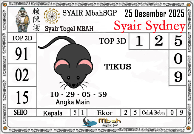 MbahSGP – Syair Sydney Mbah Sugeng 25-12-2025 – prediksi togel sydney, bocoran togel sydney, gambar syair togel sydney, syair sydney, prediksi togel wla sd, gambar syair mbahsgp, rumusan togel sydney, sydneypools. Syair mbahsgp merupakan brand syair yang telah lama dikenal oleh kalangan pemain lama didalam bermain togel. Syair mbahsgp telah lama datang dikalangan masyarakat. Oleh dikarenakan telah dipercayai banyak kalangan, maka kita tidak akan diberikan kekecewaan dalam bermain di togel sydney , Syair mbahsgp sydney yang kita sajikan ini merupakan rumusan angka dari sang prediksitor handal.