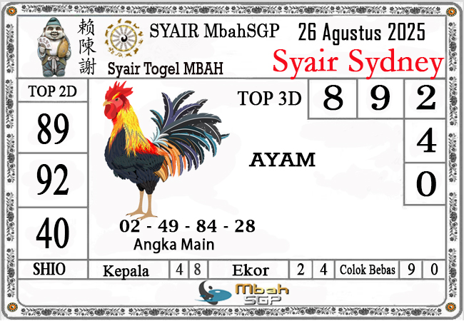 MbahSGP – Syair Sydney Mbah Sugeng 26-08-2025 – prediksi togel sydney, bocoran togel sydney, gambar syair togel sydney, syair sydney, prediksi togel wla sd, gambar syair mbahsgp, rumusan togel sydney, sydneypools. Syair mbahsgp merupakan brand syair yang telah lama dikenal oleh kalangan pemain lama didalam bermain togel. Syair mbahsgp telah lama datang dikalangan masyarakat. Oleh dikarenakan telah dipercayai banyak kalangan, maka kita tidak akan diberikan kekecewaan dalam bermain di togel sydney , Syair mbahsgp sydney yang kita sajikan ini merupakan rumusan angka dari sang prediksitor handal.