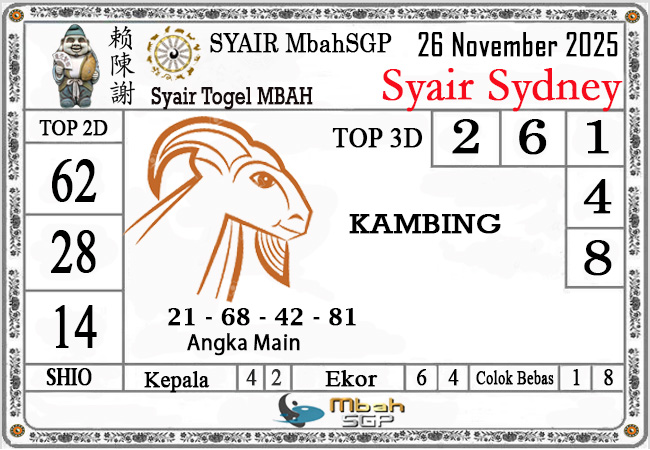 MbahSGP – Syair Sydney Mbah Sugeng 26-11-2025 – prediksi togel sydney, bocoran togel sydney, gambar syair togel sydney, syair sydney, prediksi togel wla sd, gambar syair mbahsgp, rumusan togel sydney, sydneypools. Syair mbahsgp merupakan brand syair yang telah lama dikenal oleh kalangan pemain lama didalam bermain togel. Syair mbahsgp telah lama datang dikalangan masyarakat. Oleh dikarenakan telah dipercayai banyak kalangan, maka kita tidak akan diberikan kekecewaan dalam bermain di togel sydney , Syair mbahsgp sydney yang kita sajikan ini merupakan rumusan angka dari sang prediksitor handal.