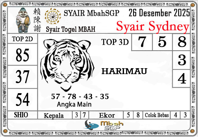 MbahSGP Syair Sydney Mbah Sugeng 26-12-2025 – prediksi togel sydney, bocoran togel sydney, gambar syair togel sydney, syair sydney, prediksi togel wla sd, gambar syair mbahsgp, rumusan togel sydney, sydneypools. Syair mbahsgp merupakan brand syair yang telah lama dikenal oleh kalangan pemain lama didalam bermain togel. Syair mbahsgp telah lama datang dikalangan masyarakat. Oleh dikarenakan telah dipercayai banyak kalangan, maka kita tidak akan diberikan kekecewaan dalam bermain di togel sydney , Syair mbahsgp sydney yang kita sajikan ini merupakan rumusan angka dari sang prediksitor handal.