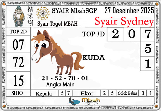 MbahSGP – Syair Sydney Mbah Sugeng 27-12-2025 – prediksi togel sydney, bocoran togel sydney, gambar syair togel sydney, syair sydney, prediksi togel wla sd, gambar syair mbahsgp, rumusan togel sydney, sydneypools. Syair mbahsgp merupakan brand syair yang telah lama dikenal oleh kalangan pemain lama didalam bermain togel. Syair mbahsgp telah lama datang dikalangan masyarakat. Oleh dikarenakan telah dipercayai banyak kalangan, maka kita tidak akan diberikan kekecewaan dalam bermain di togel sydney , Syair mbahsgp sydney yang kita sajikan ini merupakan rumusan angka dari sang prediksitor handal.
