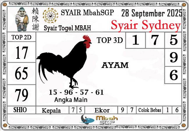 MbahSGP – Syair Sydney Mbah Sugeng 28-09-2025 – prediksi togel sydney, bocoran togel sydney, gambar syair togel sydney, syair sydney, prediksi togel wla sd, gambar syair mbahsgp, rumusan togel sydney, sydneypools. Syair mbahsgp merupakan brand syair yang telah lama dikenal oleh kalangan pemain lama didalam bermain togel. Syair mbahsgp telah lama datang dikalangan masyarakat. Oleh dikarenakan telah dipercayai banyak kalangan, maka kita tidak akan diberikan kekecewaan dalam bermain di togel sydney , Syair mbahsgp sydney yang kita sajikan ini merupakan rumusan angka dari sang prediksitor handal.