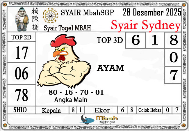 MbahSGP – Syair Sydney Mbah Sugeng 28-12-2025 – prediksi togel sydney, bocoran togel sydney, gambar syair togel sydney, syair sydney, prediksi togel wla sd, gambar syair mbahsgp, rumusan togel sydney, sydneypools. Syair mbahsgp merupakan brand syair yang telah lama dikenal oleh kalangan pemain lama didalam bermain togel. Syair mbahsgp telah lama datang dikalangan masyarakat. Oleh dikarenakan telah dipercayai banyak kalangan, maka kita tidak akan diberikan kekecewaan dalam bermain di togel sydney , Syair mbahsgp sydney yang kita sajikan ini merupakan rumusan angka dari sang prediksitor handal.