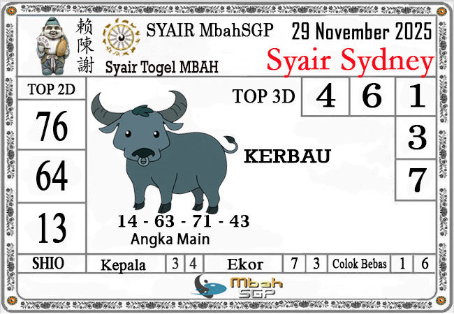 MbahSGP – Syair Sydney Mbah Sugeng 29-11-2025 – prediksi togel sydney, bocoran togel sydney, gambar syair togel sydney, syair sydney, prediksi togel wla sd, gambar syair mbahsgp, rumusan togel sydney, sydneypools. Syair mbahsgp merupakan brand syair yang telah lama dikenal oleh kalangan pemain lama didalam bermain togel. Syair mbahsgp telah lama datang dikalangan masyarakat. Oleh dikarenakan telah dipercayai banyak kalangan, maka kita tidak akan diberikan kekecewaan dalam bermain di togel sydney , Syair mbahsgp sydney yang kita sajikan ini merupakan rumusan angka dari sang prediksitor handal.
