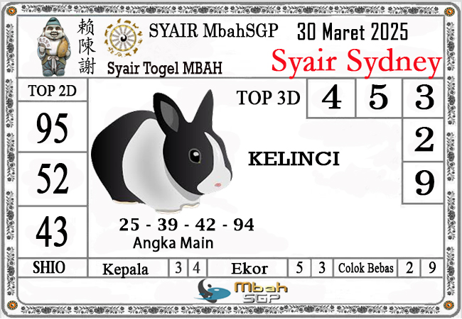 MbahSGP – Syair Sydney Mbah Sugeng 30-03-2026 – prediksi togel sydney, bocoran togel sydney, gambar syair togel sydney, syair sydney, prediksi togel wla sd, gambar syair mbahsgp, rumusan togel sydney, sydneypools. Syair mbahsgp merupakan brand syair yang telah lama dikenal oleh kalangan pemain lama didalam bermain togel. Syair mbahsgp telah lama datang dikalangan masyarakat. Oleh dikarenakan telah dipercayai banyak kalangan, maka kita tidak akan diberikan kekecewaan dalam bermain di togel sydney , Syair mbahsgp sydney yang kita sajikan ini merupakan rumusan angka dari sang prediksitor handal.