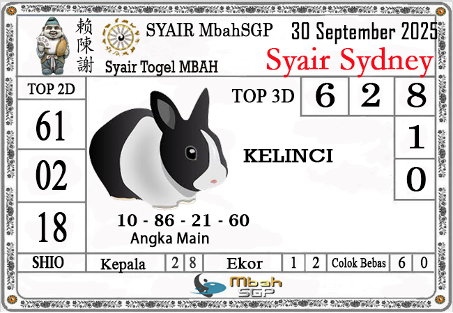 MbahSGP – Syair Sydney Mbah Sugeng 30-09-2025 – prediksi togel sydney, bocoran togel sydney, gambar syair togel sydney, syair sydney, prediksi togel wla sd, gambar syair mbahsgp, rumusan togel sydney, sydneypools. Syair mbahsgp merupakan brand syair yang telah lama dikenal oleh kalangan pemain lama didalam bermain togel. Syair mbahsgp telah lama datang dikalangan masyarakat. Oleh dikarenakan telah dipercayai banyak kalangan, maka kita tidak akan diberikan kekecewaan dalam bermain di togel sydney , Syair mbahsgp sydney yang kita sajikan ini merupakan rumusan angka dari sang prediksitor handal.