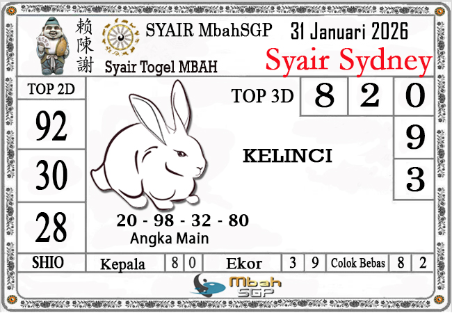 MbahSGP – Syair Sydney Mbah Sugeng 31-01-2026 – prediksi togel sydney, bocoran togel sydney, gambar syair togel sydney, syair sydney, prediksi togel wla sd, gambar syair mbahsgp, rumusan togel sydney, sydneypools. Syair mbahsgp merupakan brand syair yang telah lama dikenal oleh kalangan pemain lama didalam bermain togel. Syair mbahsgp telah lama datang dikalangan masyarakat. Oleh dikarenakan telah dipercayai banyak kalangan, maka kita tidak akan diberikan kekecewaan dalam bermain di togel sydney , Syair mbahsgp sydney yang kita sajikan ini merupakan rumusan angka dari sang prediksitor handal.